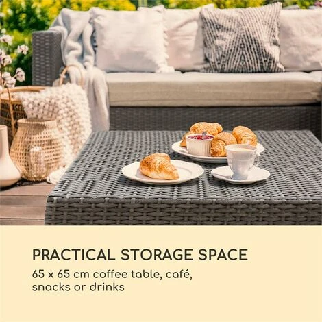 Con il set Theia Lounge di Blumfeldt, ogni membro della famiglia trova il suo comodo posto a sedere all’aria aperta: sul divano ad angolo con ottomano o sul grande sgabello trovano posto fino a quattro persone, in modo da godersi in pieno agio qualche ora in compagnia. Un vero piacere sono anche le imbottiture spesse 10 cm, che soddisfano praticamente tutti i vostri desideri di relax. Per completare il comfort, si trovano cinque soffici cuscini da 20 cm: sarĂ come adagiarsi su una nuvola. Praticissimo è senza dubbio l’EasyComfort Concept del set ad angolo Theia Lounge di Blumfeldt: togliendo l’imbottitura, lo sgabello si trasforma in un tavolino per il divano, ideale per poggiare bibite, snack o il servizio da caffè.
