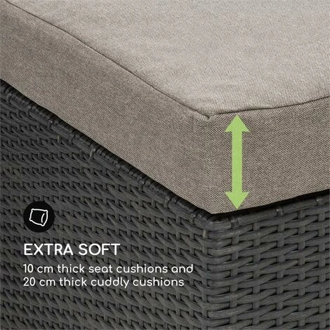 Per potersi godere a lungo il set di mobili da giardino Theia Lounge di Blumfeldt, tutti i componenti sono resistenti alle intemperie ed estremamente robusti: i telai in acciaio sono completamente zincati e rivestiti a polveri, in modo da non arrugginire. Il rivestimento in polirattan con effetto vimini intrecciato è resistente ai raggi UV ed è molto resistente. Per dare sfogo alla vostra creatività , le imbottiture e i cuscini sono privi di coperture, in modo da poter scegliere la combinazione cromatica più accattivante con i nostri tre set disponibili.