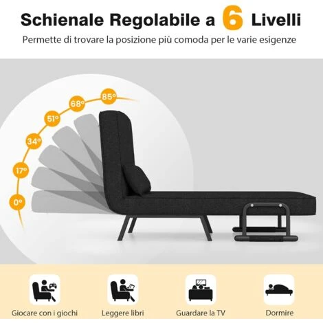 Questa poltrona letto è la scelta ideale per la vostra famiglia. Può essere utilizzata come letto, divano e poltrona, per soddisfare tutte le esigenze di seduta e di riposo. I cuscini della seduta sono realizzati in tessuto di lino di prima qualità e spugna elastica per il massimo della comodità. Il morbido cuscino aggiunge ulteriore comfort. È anche possibile appoggiare le braccia sui braccioli per rilassarsi. Il cuscino sfoderabile è facile da pulire. Inoltre, il divano letto è sostenuto da gambe in metallo, sufficientemente robuste per sostenere un’elevata capacità di carico. Inoltre, le gambe pieghevoli e nascoste possono essere riposte all’interno dello schienale quando non vengono utilizzate.