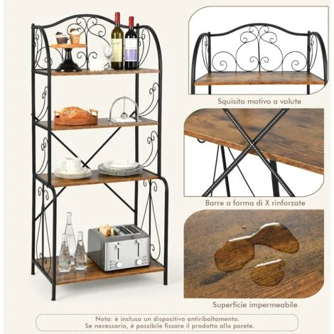 Lo scaffale da cucina autoportante con 4 ripiani aperti consente di sfruttare appieno lo spazio e di riporre facilmente tutti i vostri oggetti. Realizzato in MDF resistente e metallo per impieghi gravosi, questo prodotto vi durerà per moltissimo tempo. Inoltre, la sbarra a X rinforzata e il dispositivo antiribaltamento ne migliorano notevolmente la stabilità, per fornire a voi e alla vostra famiglia un prodotto assolutamente sicuro. I feltrini antiscivolo proteggono il pavimento da graffi e scalfitture. Utilizzato come ripiano per riporre o esporre oggetti, darà un tocco di classe al vostro spazio vitale e migliorerà la qualità della vostra vita.