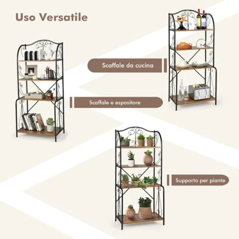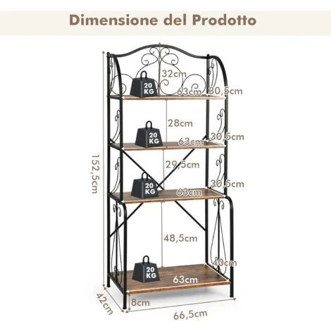 - Grande Capacità di Stoccaggio per una Cucina Ordinata: Questo scaffale da cucina è progettato con 4 ampi ripiani che consentono di riporre una varietà di oggetti, come stoviglie, vasellame, vino, bicchieri, forno a microonde, ecc. Il design aperto del ripiano consente di recuperare facilmente e rapidamente ciò che si desidera.