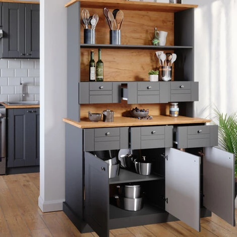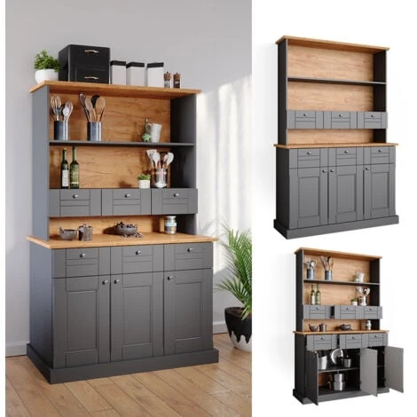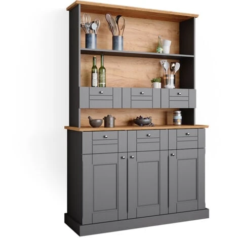 Lo scaffale superiore è dotato di cassetti e di un ripiano fisso. Qui puoi esporre al meglio le tue stoviglie preferite e molte altre decorazioni. I ripiani superiori con meravigliose fantasie effetto rovere completano l’estetica del mobile.