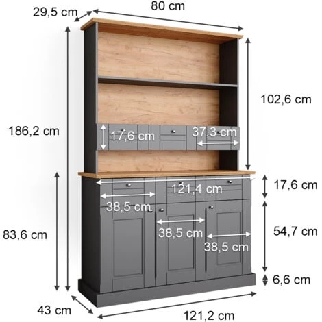 - Le dimensioni complessive della dispensa con vetrina 121,4 x 186,2 x 43 cm (LxHxP).