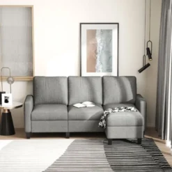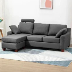 HomCom Divano A 3 Posti Con Poggiapiedi E Cuscini In Tessuto Di Lino, Grigio Scuro, 194x80x86cm