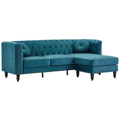 Vuoi creare un’atmosfera accogliente nel tuo soggiorno? Il divano TURNER sarà il tuo divano ideale. Ispirato al mitico modello chesterfield, darà un tocco vintage ai tuoi interni. Il rivestimento in velluto e la finitura con borchie lo rendono un divano glamour che aggiungerà morbidezza e stile alla tua stanza. Grazie alla sua angolazione reversibile, puoi scegliere l’angolo più adatto al tuo salotto in un batter d’occhio.