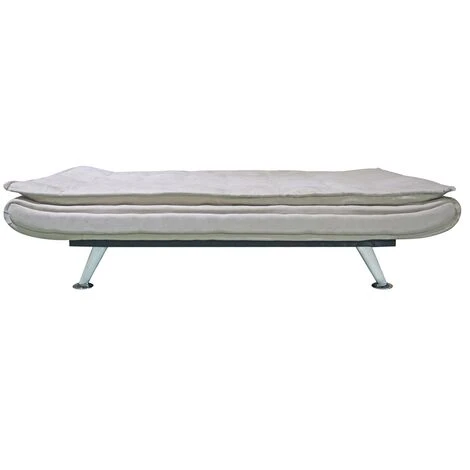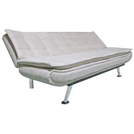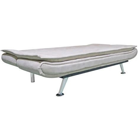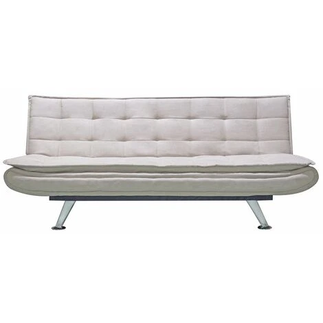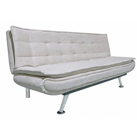Divano letto 3 posti con rivestimento in microfibra. Dimensioni divano (LxPxA): 196x80x90 cm – Altezza seduta 41cm – Dimensioni letto: 196x102x41 cm – 4 piedi cromati di 20cm. Solida struttura in legno. Colore beige. – Schienale e seduta trapuntati. Dimensioni imballo (LxPxA): 196x103x42 cm. Peso: 35 Kg.