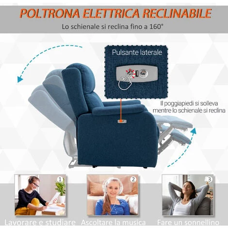 Con questa poltrona reclinabile HOMCOM crei un’atmosfera accogliente e rilassante nella tua casa! L’ampia seduta, i braccioli e lo schienale sono imbottiti con gommapiuma ad alta densità e rivestiti in morbido lino blu. Premendo il pulsante laterale, puoi inclinare lo schienale fino a 160° (e alzare, contemporaneamente, il poggiapiedi). Accomodati sulla tua nuova poltrona, lasciati avvolgere dal suo design ergonomico e abbandona tutto lo stress che hai accumulato durante la giornata!