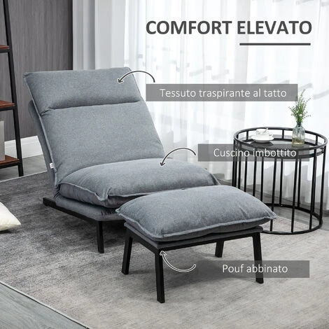 Rilassati al massimo con questa poltrona reclinabile HOMCOM. Ha un design moderno senza braccioli e una spessa imbottitura con rivestimento in tessuto traspirante. Lo schienale reclinabile su 4 posizioni ti permette di trovare il livello di comfort su misura per le tue esigenze e grazie al pouf abbinato ti abbandoni completamente al relax.