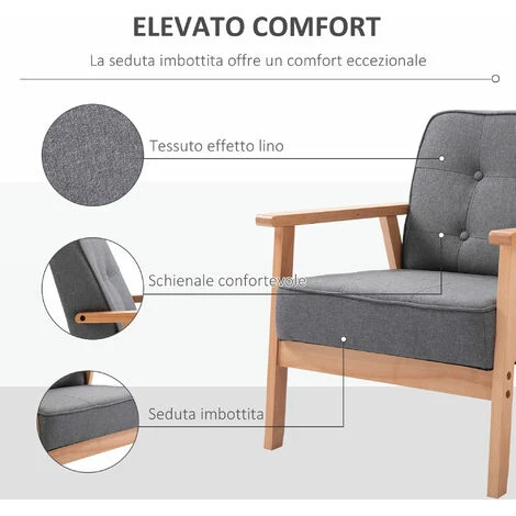Questa sedia vintage di HOMCOM, un po’ retrò e un po’ in stile scandinavo, è una splendida aggiunta a qualsiasi stanza. Usala come parte del tuo mobilio da salotto o semplicemente come poltrona per leggere e rilassarti. È fatta in legno massiccio e rivestita con tessuto di lino. I braccioli e i cuscini hanno una spessa imbottitura, risultando estremamente comodi, mentre le gambe in legno aggiungono un tocco di eleganza e stile. Questa è la poltrona ideale da avere in sala, salotto, camera da letto, studio, ma è molto apprezzata anche da bar, locali e bistrò.