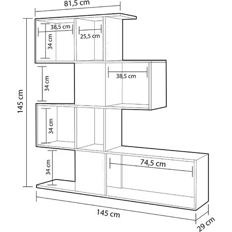 - Dimensioni della libreria a zig zag: altezza 145 cm, larghezza 145 cm, profondità 29 cm