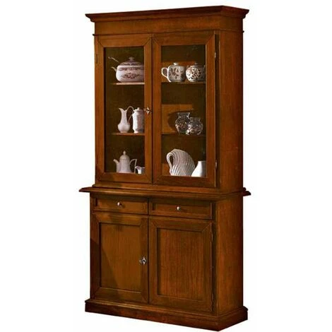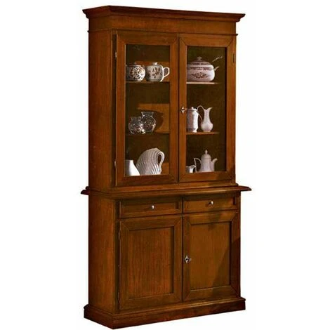 Dotata di 2 porte in vetro battenti, 3 ripiani interni, 2 cassetti scorrevoli e 2 porte in legno battenti, per tenere in ordine e a portata di mano piatti, bicchieri, posate, tovaglie e molto altro. Grazie alle 2 ante in vetro, inoltre, questa credenza con vetrina è utile per esporre in bella vista le stoviglie più preziose, assieme alle porcellane e all’argenteria. Mobile realizzato esclusivamente in Italia da artigiani italiani.