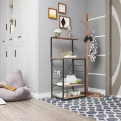 WOLTU Scaffale Per Cucina In Acciaio Legno 4 Ripiani Ganci Carrello Microonde Legno+Nero
