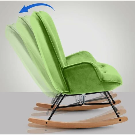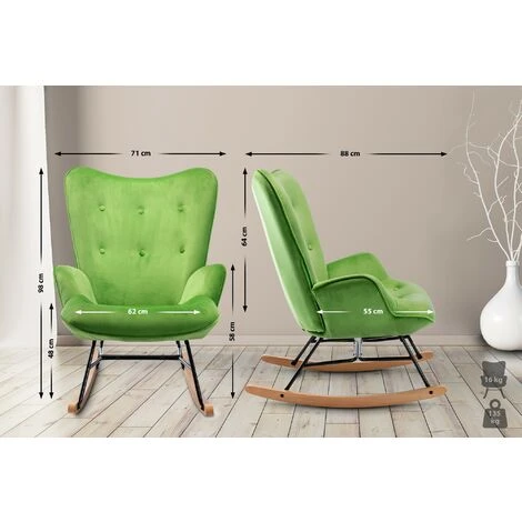 La sedia oscillante è confortevole, solida e ottimale per arredare. Il design si presenta moderno avvicinandosi a quello Chesterfield inglese ed è adatto per essere inserito in qualunque stanza senza intaccare lo stile di arredamento precedentemente scelto. Lo schienale alto e imbottito, decorato con bottoni ornamentali, è rivestito in pregiato velluto e conferisce morbidezza per un comfort prolungato anche in caso di utilizzo prolungato. Il telaio in robusto legno di faggio, con parti in metallo laccato, garantisce grande stabilità anche durante il movimento oscillante.