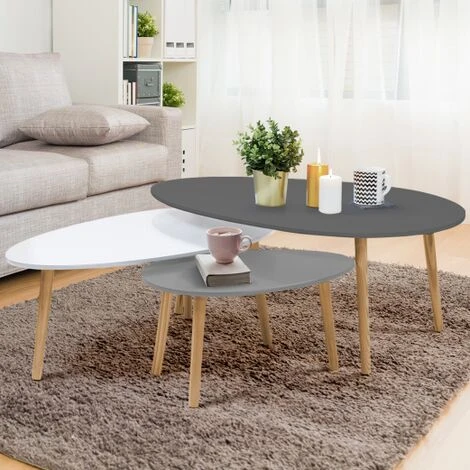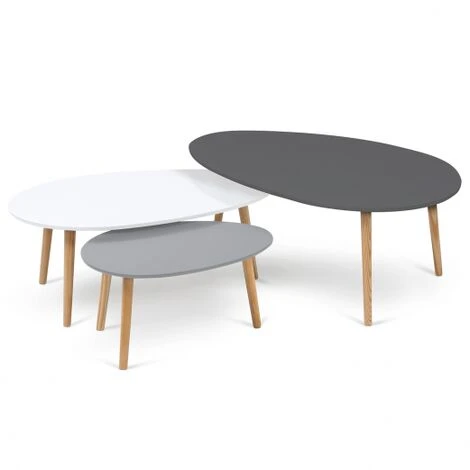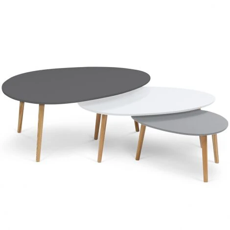 Questo set di 3 tavolini darà un tocco contemporaneo al vostro salotto. Il design di questi tavoli, ispirato allo stile nordico, è ultra-trendy, semplice e sofisticato allo stesso tempo.Siete liberi di disporre ogni tavolino come desiderate per creare l’interno che fa per voi. Elementi decorativi o tavolini per riporre riviste, telecomandi, lampade e piccole piante: ognuno avrà il suo utilizzo! Ideale per le vostre serate televisive o per gli aperitivi con gli amici, potete anche posizionarli facilmente l’uno sotto l’altro per risparmiare spazio! I tavolini da salotto sono un vero e proprio elemento decorativo e aggiungeranno un certo fascino ai vostri interni. Grazie alla loro forma ovale e alle robuste gambe in legno di pino, questi robusti tavolini da caffè conferiscono calore al vostro spazio abitativo.La superficie laccata lucida dei tavoli conferisce un tocco contemporaneo agli interni e una finitura raffinata. Infine, i colori laccati grigio scuro, grigio chiaro e bianco creano luce e contrasto, per un design pulito, chic e moderno.Questo set di tre tavolini da caffè farà un figurone nel vostro salotto, sia che abbiate un salotto piccolo o molto grande. Questo set di 3 tavolini da caffè sarà perfetto per il vostro salotto.Dimensioni dei 3 tavolini da salotto GIGIDimensioni tavolo grande: lunghezza 98 cm x larghezza 60 cm x altezza 40 cm Dimensioni tavolo medio: lunghezza 88 cm x larghezza 48 cm x altezza 34 cmDimensioni tavolo piccolo: lunghezza 60 cm x larghezza 38 cm x altezza 30 cmQuesto set di tavolini è disponibile in diversi colori: – Set di 3 tavolini nidificanti bianco/grigio/grafico- Set di 3 tavolini nidificanti bianco/grigio chiaro/grigio scuro- Set di 3 tavolini da salotto GIGI, laccato bianco- Set di 3 tavolini GIGI, laccati bianco/blu- Set di 2 tavolini nidificanti PM grigio e GM laccato bianco- Set di 2 tavolini nidificanti PM laccati bianco e grigio GM