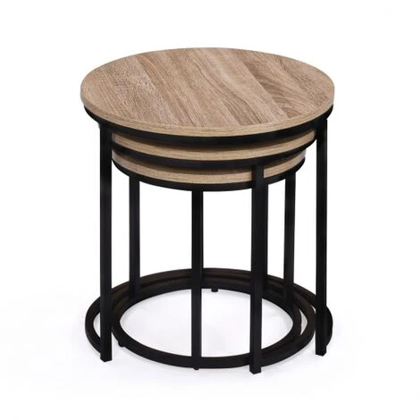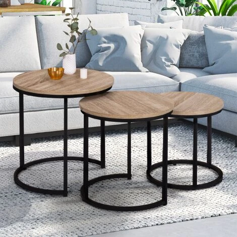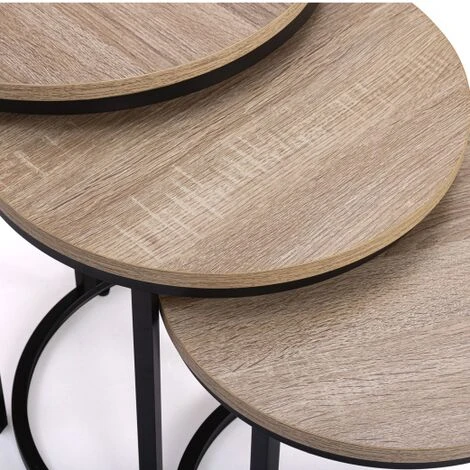Questo tavolo sarà perfetto in salotto o in ufficio. Le loro linee sobrie e pure ne fanno un elemento decorativo a sé stante, che si adatta perfettamente ai vostri interni. Il piano del tavolo è realizzato in truciolato (spessore 1,5 cm) in colore legno naturale e conferirà al vostro salotto un aspetto caldo e autentico. La struttura rotonda in metallo nero vi darà stabilità e solidità.Questi 3 tavolini rotondi sono funzionali e pratici e possono essere disposti a piacere. Potete metterli uno accanto all’altro per un aperitivo con gli amici o impilarli uno sotto l’altro per risparmiare spazio!In camera da letto, in salotto o anche in veranda, questi tavolini possono essere collocati ovunque. Si possono usare come tavolini da caffè, tavolini laterali, estremità di divani o addirittura comodini! Non esitate a utilizzare i vassoi per collocare candele, piante verdi, lampade, oggetti decorativi… per un look 100% industriale!Questo set di 3 tavolini rotondi è perfetto per uno stile moderno!Dimensioni dei tavoli: 35/40/45 cmTavolino piccolo: Lunghezza 35 cm x larghezza 35 cm x altezza 35 cmTavolino medio: Lunghezza 40 cm x larghezza 40 cm x altezza 40 cmTavolino grande: Lunghezza 45 cm x larghezza 45 cm x altezza 45 cmSpessore dei tubi di metallo: 1,6 cm x 1,6 cmSpessore del legno: 1,5 cmPer assemblare da soliTrovate la nostra intera collezione industriale e tutti i nostri tavolini da caffè a nido nel nostro negozio online!