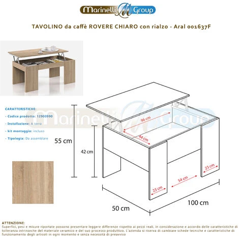Tavolino da caffe’ sollevabile 100 X 50 X 43 cm con rialzo salvaspazio soggiorno ROVERE 001637F