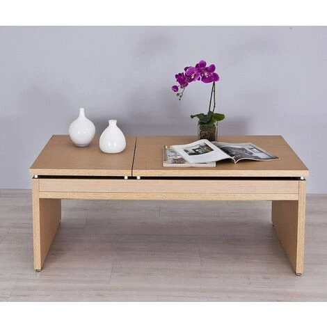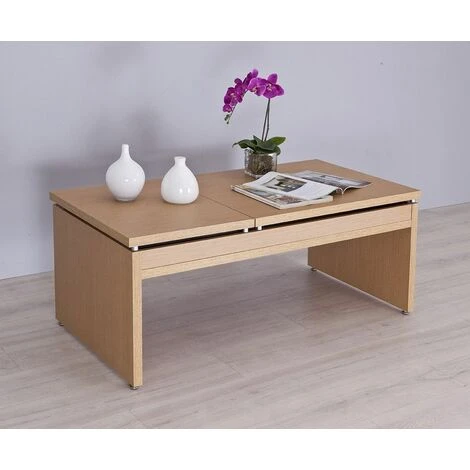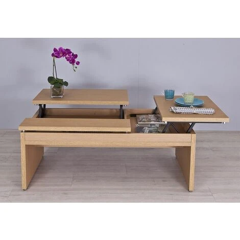 Tavolino da centro elevabile sia frontalmente che lateralmente che permette svariati usi ed è ideale per essere collocata in un salone con divano e chaise longue. La base si solleva, svelando uno sp…