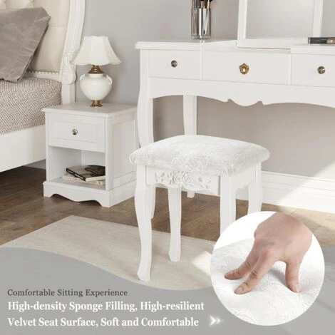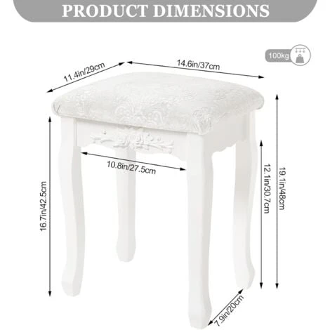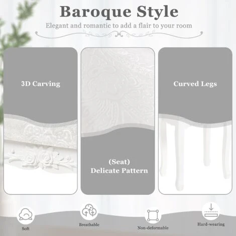 Oltre al suo design accattivante. lo sgabello di vanità. è. estremamente pratico. Tutti gli elementi sono realizzati in MDF e a mano. La finitura bianca conferisce lo sgabello anche uno degli elementi contemporanei. eleganti e chiari. Lo sgabello è. ben imbottito e può. essere combinato con un tavolo da toeletta. .